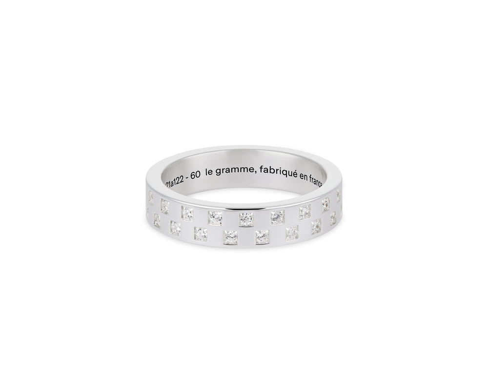 Type : bagueFinition : poliEmpreinte : lisseSertissage : damier diamants blancsCaratage : 38 diamants blancs brillants GVS 0,57ctMatière : argent 925